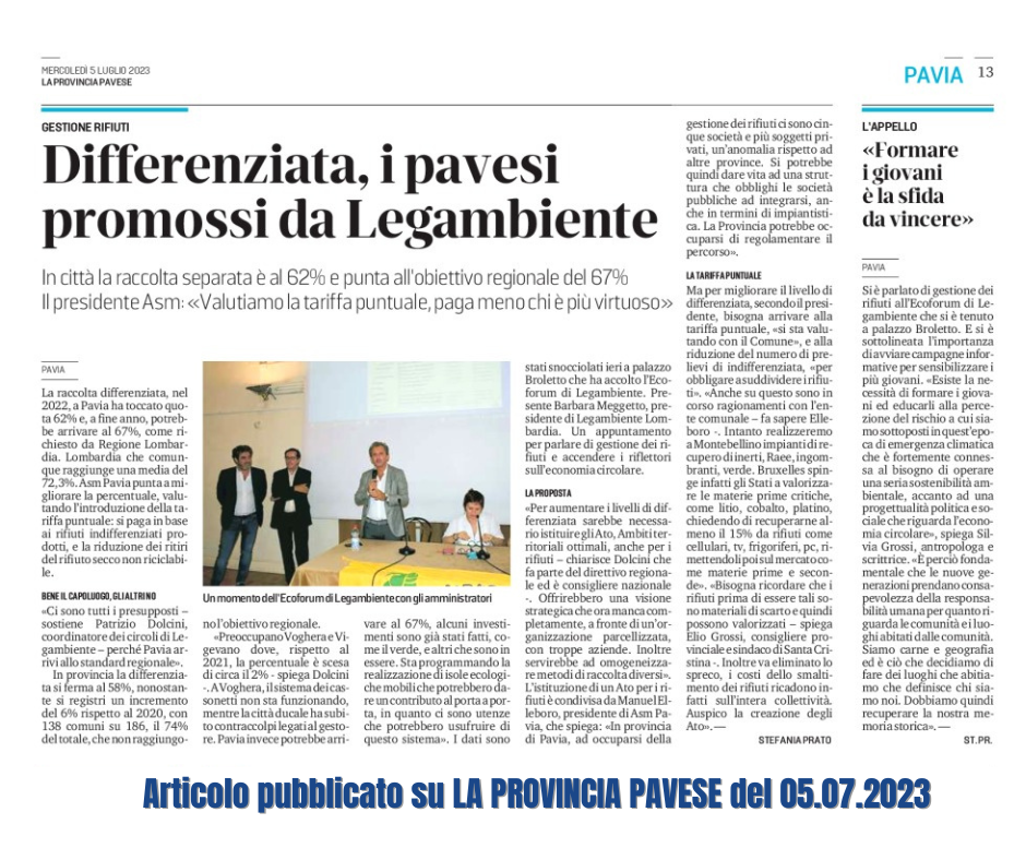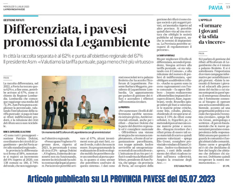 Il 4 luglio 2023 il Presidente e AD di ASM Pavia Dott. Geol. Manuel Elleboro e il Direttore Generale Ing. Giuseppe Maria Chirico, hanno partecipato come relatori all’ECOFORUM, un importante momento di incontro organizzato da Legambiente, per parlare della gestione dei rifiuti nel pavese e accendere i riflettori sull’economia circolare.