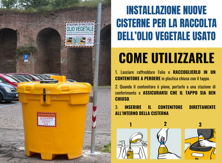 A partire da oggi ASM Pavia sta provvedendo alla sostituzione delle cisterne stradali per la raccolta degli olii vegetali esausti posizionate sul territorio del Comune di Pavia. Le nuove cisterne, salvo eventuali problemi tecnici, verranno posizionate negli stessi punti dove erano installate quelle precedenti, con l’aggiunta di due nuove postazioni in Viale Gorizia e in Via Olevano. La principale novità, rispetto alle cisterne precedenti, consiste nel fatto che 𝗻𝗼𝗻 𝘀𝗶 𝗱𝗼𝘃𝗿𝗮̀ 𝗽𝗶𝘂̀ 𝘃𝗲𝗿𝘀𝗮𝗿𝗲 𝗹’𝗼𝗹𝗶𝗼 𝗮𝗹 𝗹𝗼𝗿𝗼 𝗶𝗻𝘁𝗲𝗿𝗻𝗼, 𝗺𝗮 𝘀𝗶 𝗱𝗼𝘃𝗿𝗮𝗻𝗻𝗼 𝗰𝗼𝗻𝗳𝗲𝗿𝗶𝗿𝗲 𝗱𝗶𝗿𝗲𝘁𝘁𝗮𝗺𝗲𝗻𝘁𝗲 𝗹𝗲 𝗯𝗼𝘁𝘁𝗶𝗴𝗹𝗶𝗲/𝗰𝗼𝗻𝘁𝗲𝗻𝗶𝘁𝗼𝗿𝗶 𝗶𝗻 𝗽𝗹𝗮𝘀𝘁𝗶𝗰𝗮 𝗽𝗶𝗲𝗻𝗶 𝗲 𝗰𝗵𝗶𝘂𝘀𝗶. Grazie a questo nuovo sistema di raccolta, puntiamo ad una notevole riduzione del problema dell’abbandono di bottiglie e barattoli pieni all’esterno dei contenitori ed al recupero di olii di qualità migliore, evitando contaminazioni.